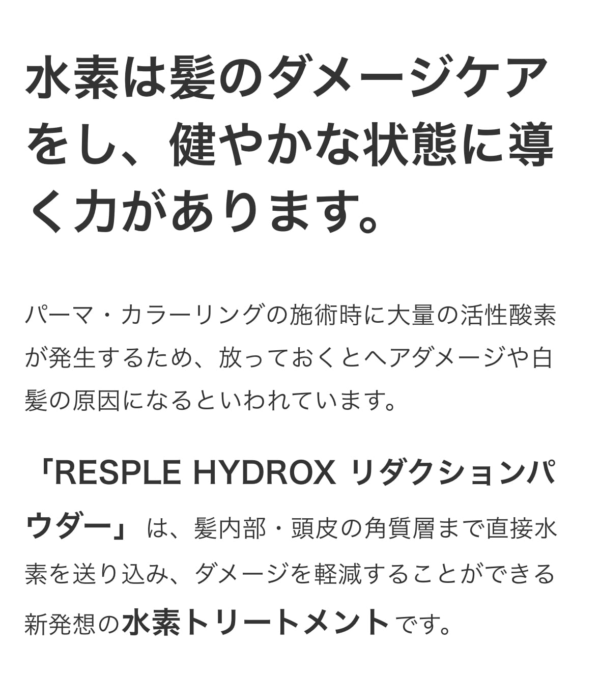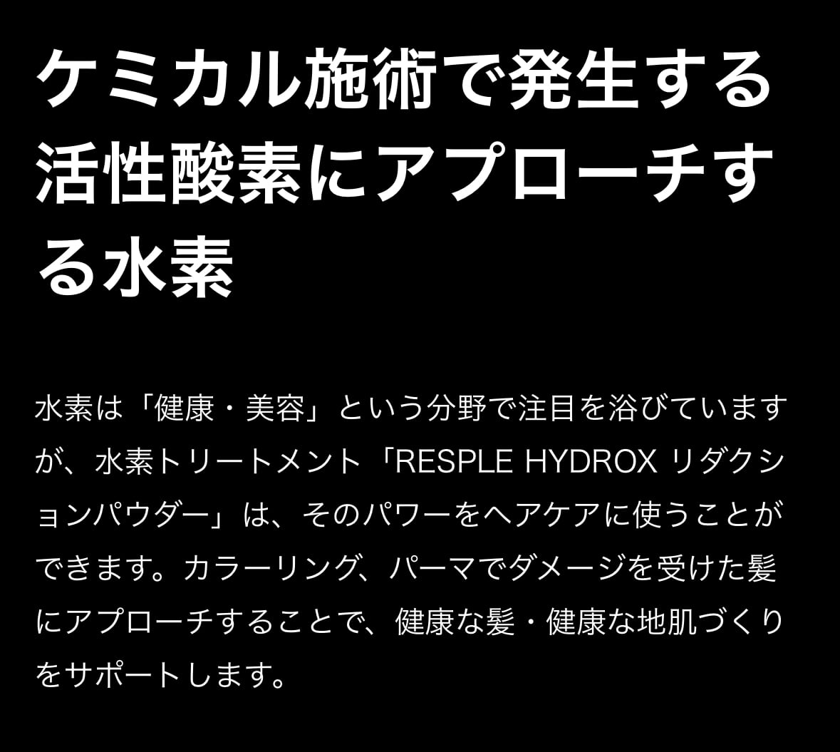 水素は「健康・美容」という分野で注目を浴びていますが、水素トリートメント「RESPLE HYDROX リダクションパウダー」は、そのパワーをヘアケアに使うことができます。カラーリング、パーマでダメージを受けた髪にアプローチすることで、健康な髪・健康な地肌づくりをサポートします。
