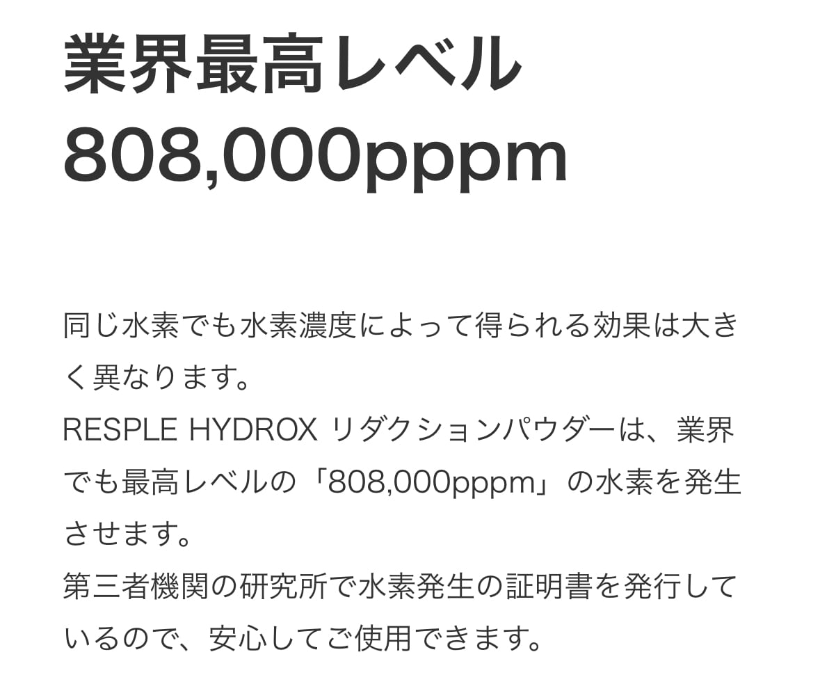 RESPLE HYDROX リダクションパウダーは、業界でも最高レベルの「808,000pppm」の水素を発生させます。