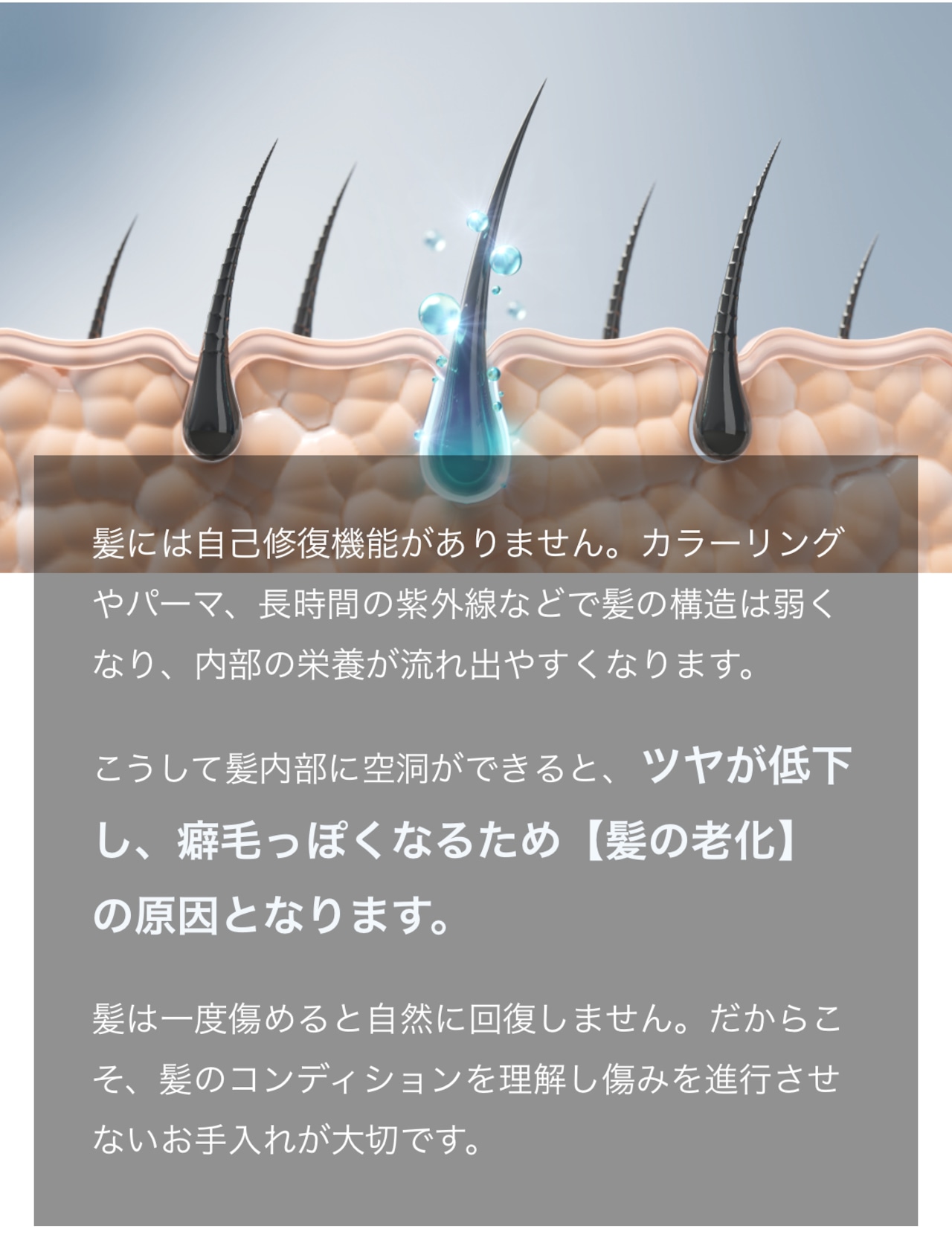 髪には自己修復機能がありません。カラーリングやパーマ、長時間の紫外線などで髪の構造は弱くなり、内部の栄養が流れ出やすくなります。