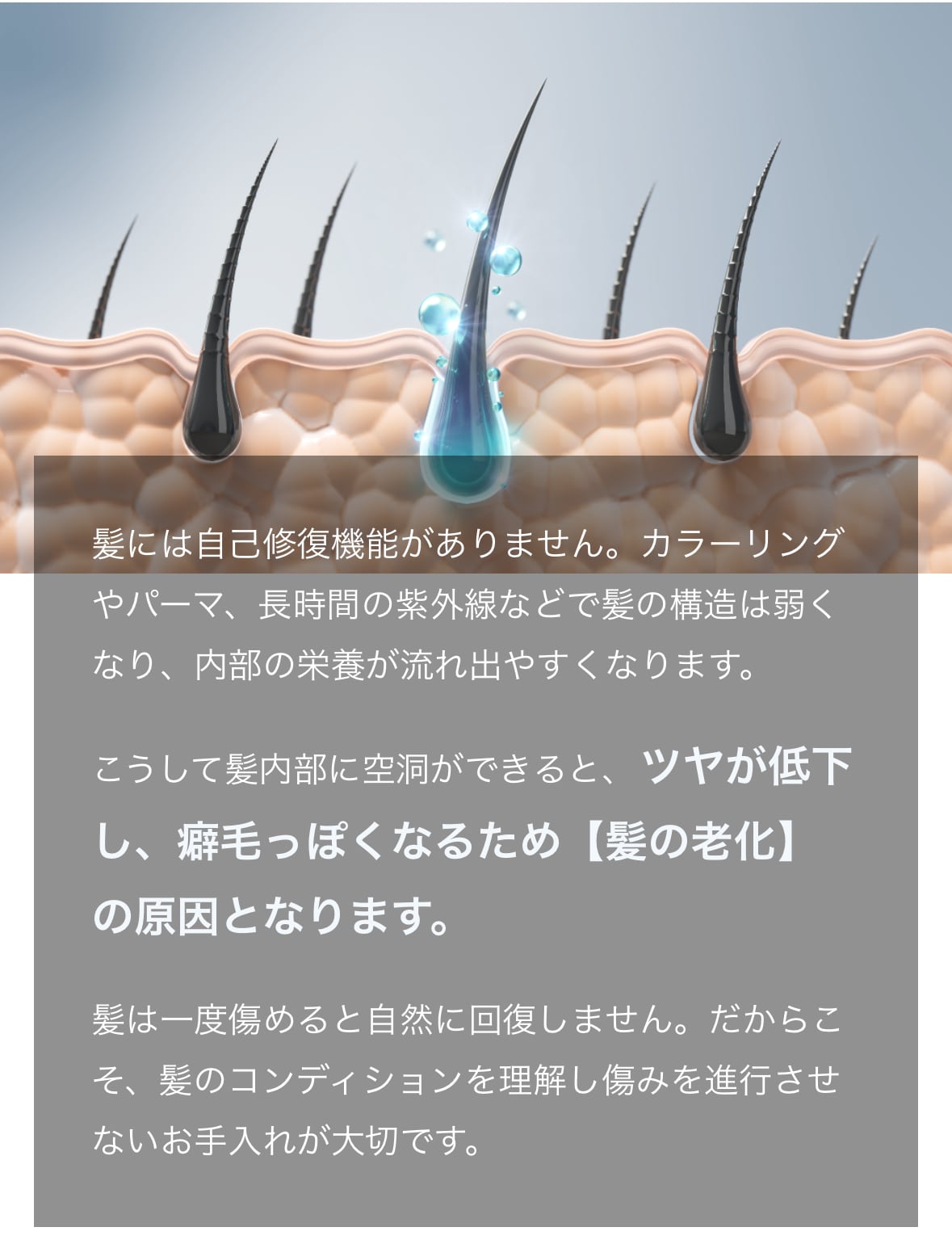 こうして髪内部に空洞ができると、ツヤが低下し、癖毛っぽくなるため【髪の老化】の原因となります。