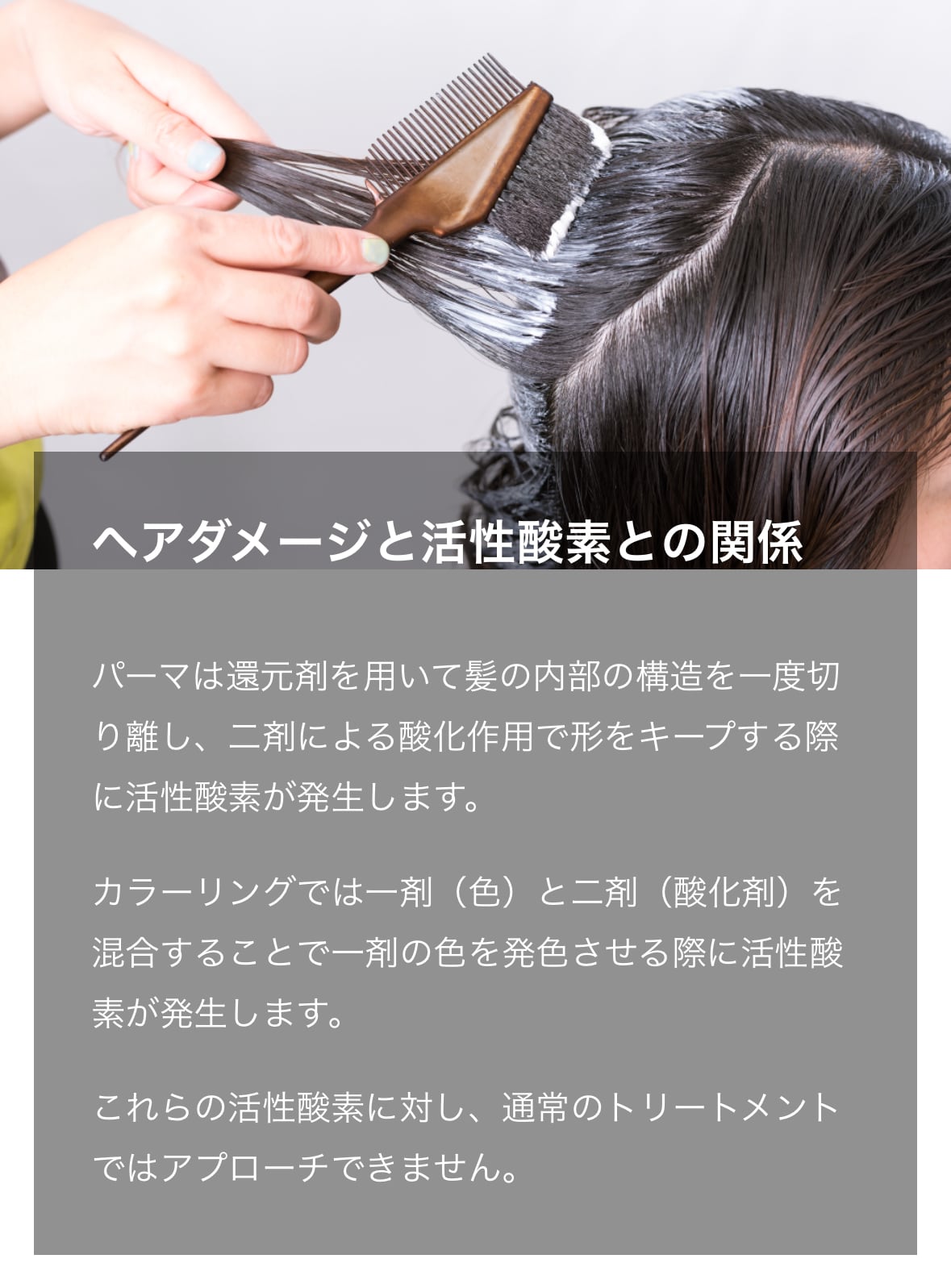 パーマ・カラーリングの施術時に大量の活性酸素が発生するため、放っておくとヘアダメージや白髪の原因になるといわれています。